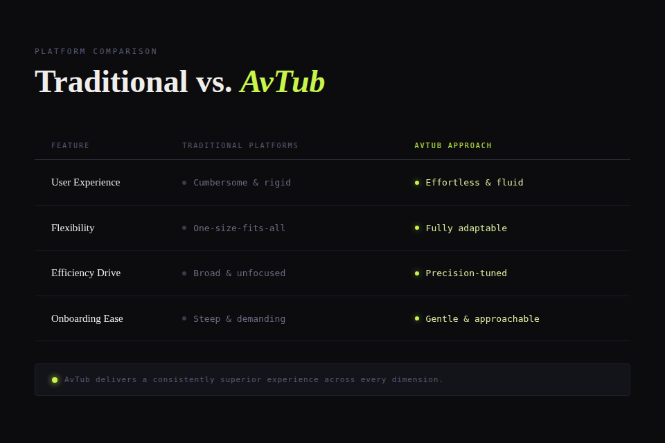 The following table offers a concise conceptual comparison between AvTub and traditional digital systems, highlighting the key differences that set them apart: