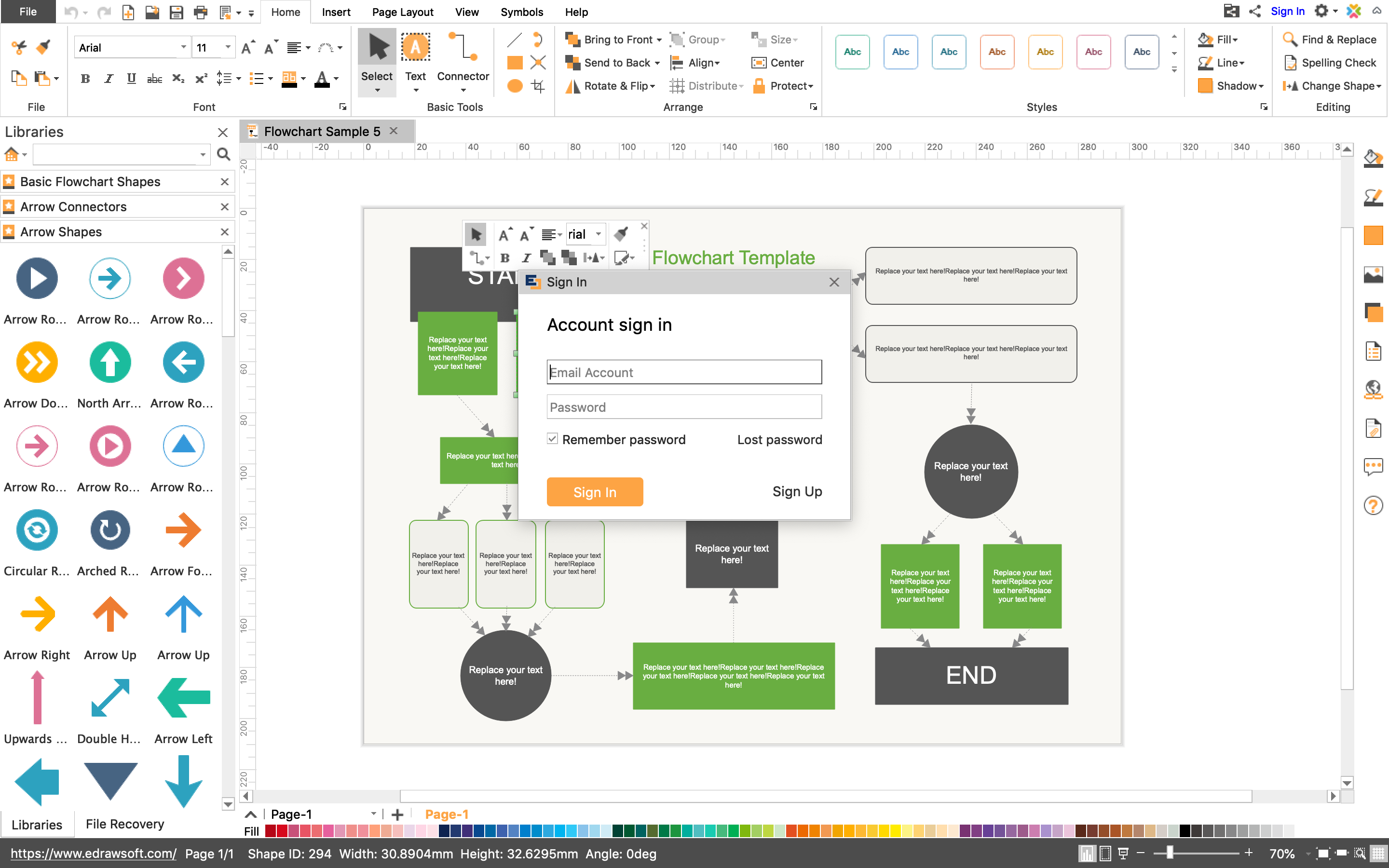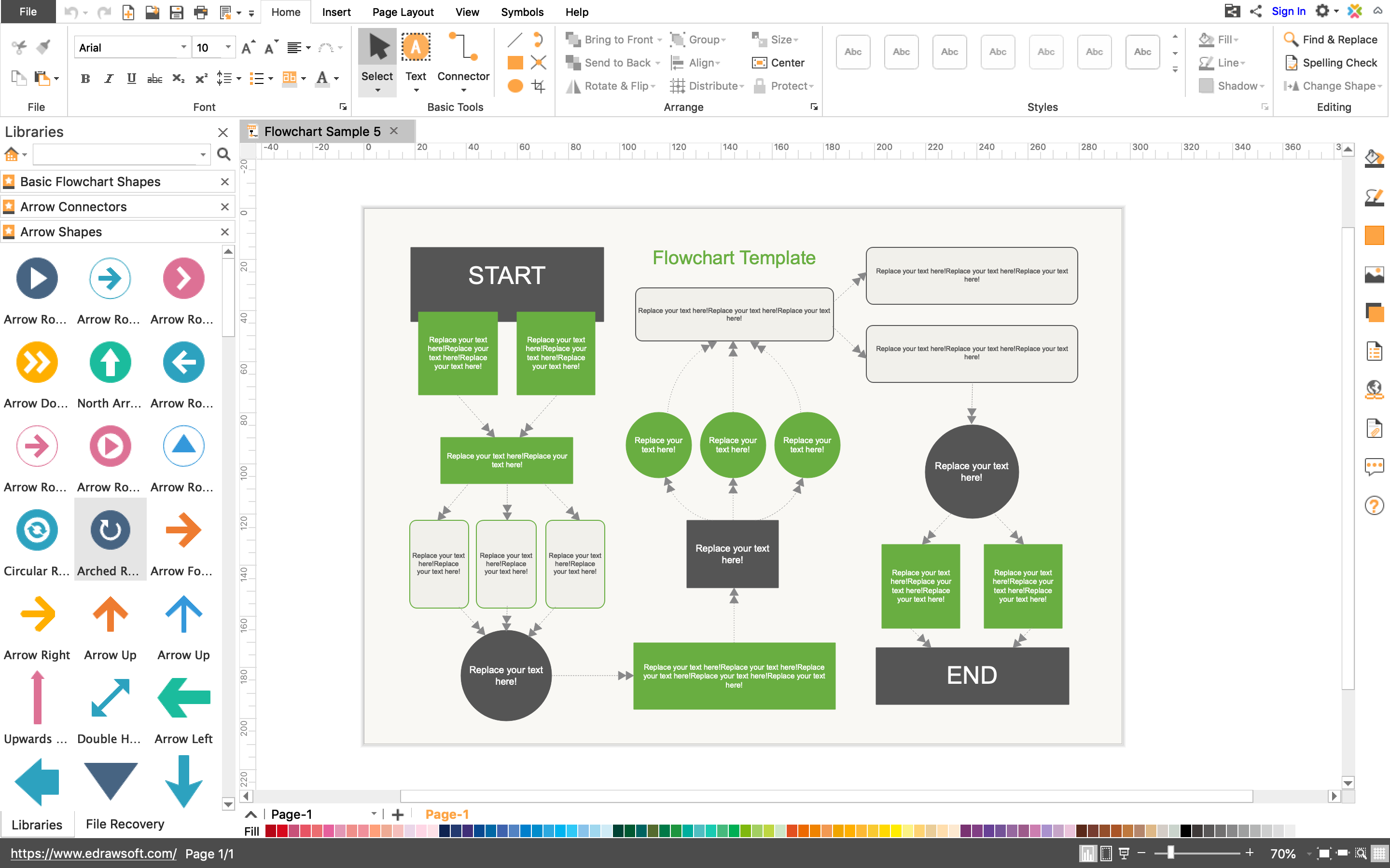 You double-click on a template and Edraw Max takes you to the editing interface. Here too, you’ve two major options. One, you can simply edit the text content and optimize the diagram for your needs. Two, if you’re a tad creative, you can bring in new elements and make the diagram even more impressive. Depending on the template you have chosen, Edraw Max would display an amazing collection of diagram elements, such as arrow connectors, basic shapes and arrow shapes.