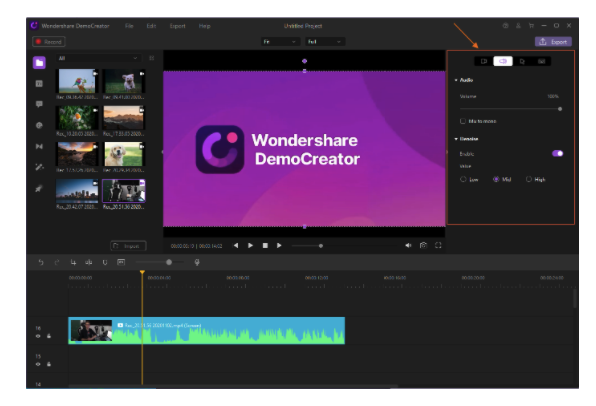 In order to change the volume of background audio or music, go to the audio tab present on the right side. DemoCreator has an in-built noise reduction feature which allows removing any unwanted glitch in the audio of your video.