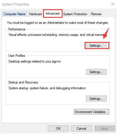 Click on Advanced tab and press Settings button on System Properties window.