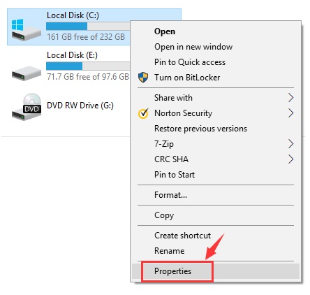 Now locate the drive that you want to check, right-click on it and select Properties.