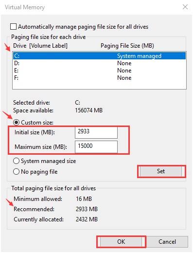 Here, make sure “Automatically manage paging file size for all drives” option is unchecked.