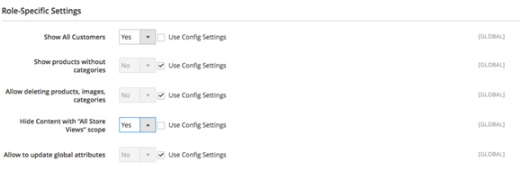 Giving the same level of access to each sub-admin can jeopardize the consistency and privacy of data, since one of the store managers can make major changes in the product data of the other. This may cause multiple issues, ranging from mismatched product descriptions up to revenue loss due to incorrect pricing. Luckily, the module allows restricting sub-admins’ access permissions to Store Views, Websites or Product Categories, as well as restrict editing of Global attributes, products, and product categories.