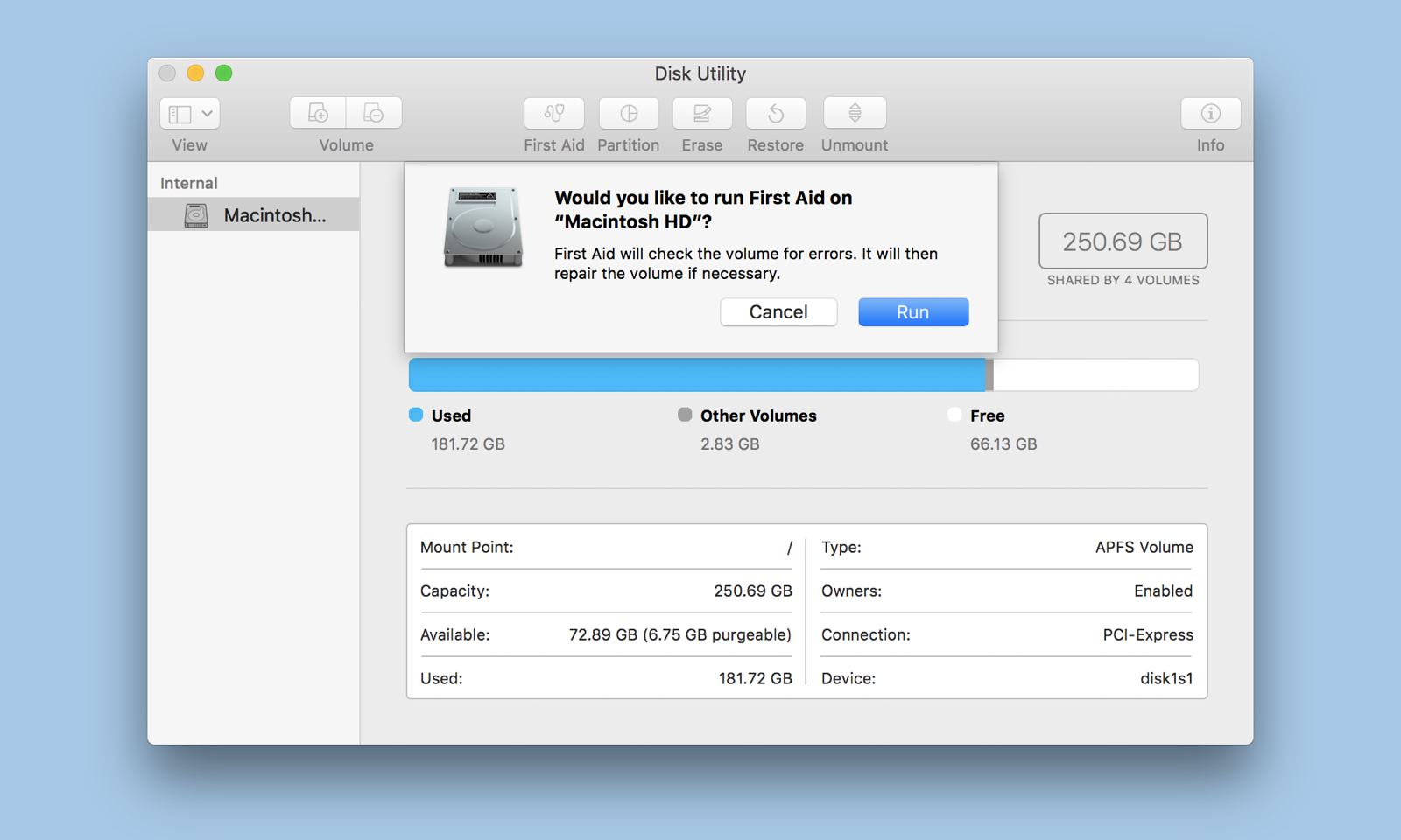 2. First Aid. First Aid can check and fix minor errors on a disk. Select the external hard drive, and then click on “First Aid” and “Run”.