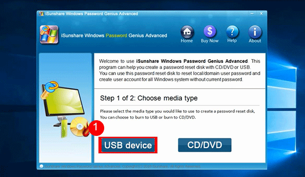 It is easy to create the password reset disk as there are the clear guides on the program. When you run iSunshare Windows Password Genius, you will see the first step to create the reset disk: choose the media type. Then you will go to the second step: burn the reset disk. You just need to plug the USB flash drive into the computer and click “Begin burning”.