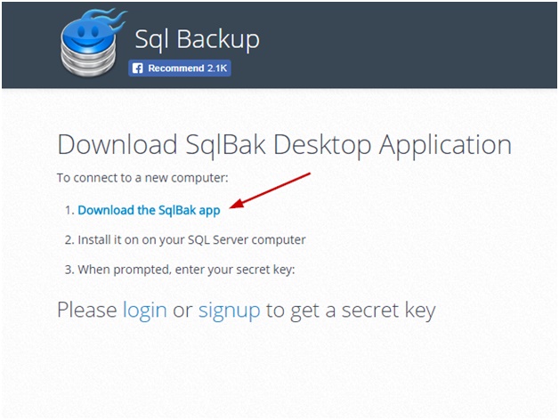 Click the link “Download the SqlBak app” and once downloaded, install it on your PC. Finally, launch the app.