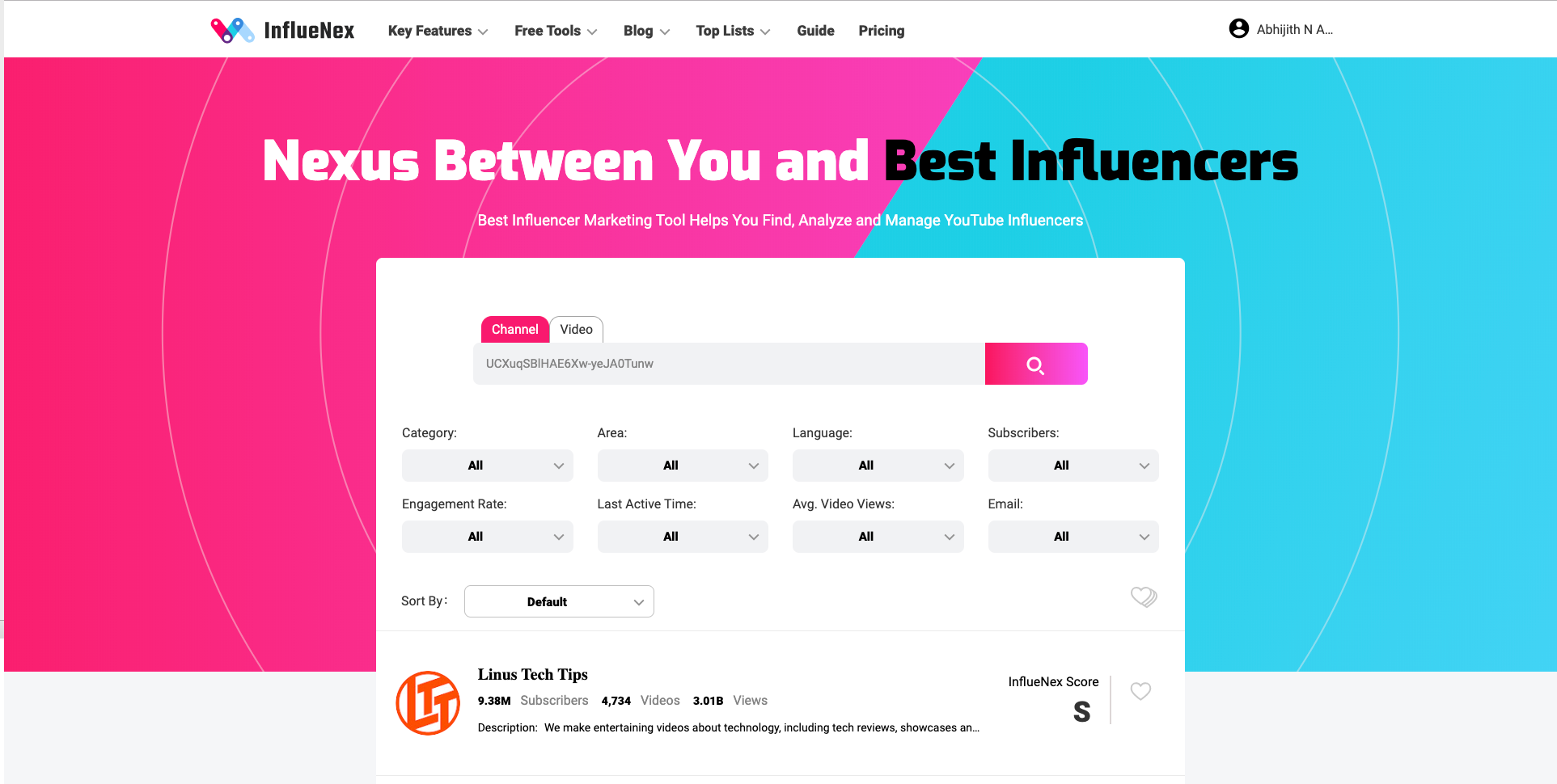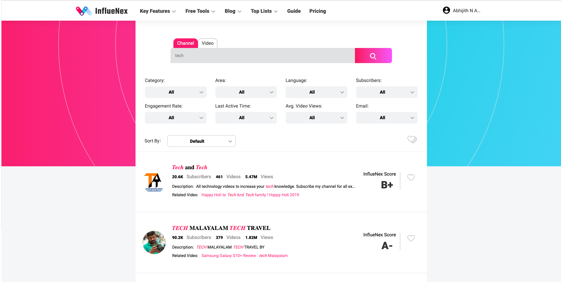 Now, you can see the search bar with a few filters below the bar. You can either search the keywords related to who you want to influence or provide the exact name of the YouTube channel. As you can see, a variety of filters like Category, Area, Language, Engagement Rate, Email etc. are available. Make the right choice and hit the Search button to proceed.