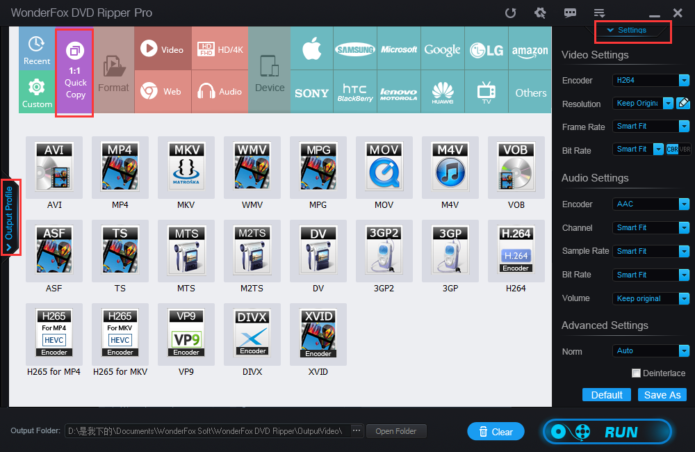 Automatically select the main movie details, so that users avoid the wrong choice main movie. Click on “Output profile” to select the output format in this interface. You can see that the software supports multiple formats, multiple devices and 1:1quickly copy. Click on “Settings”, you can customize the output format by changing the Encoder, resolution, frame rate, bit rate, etc.